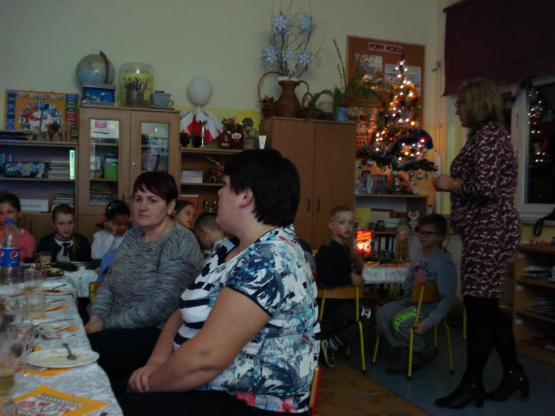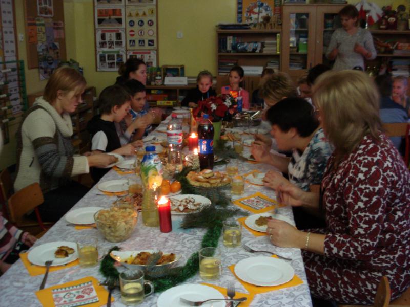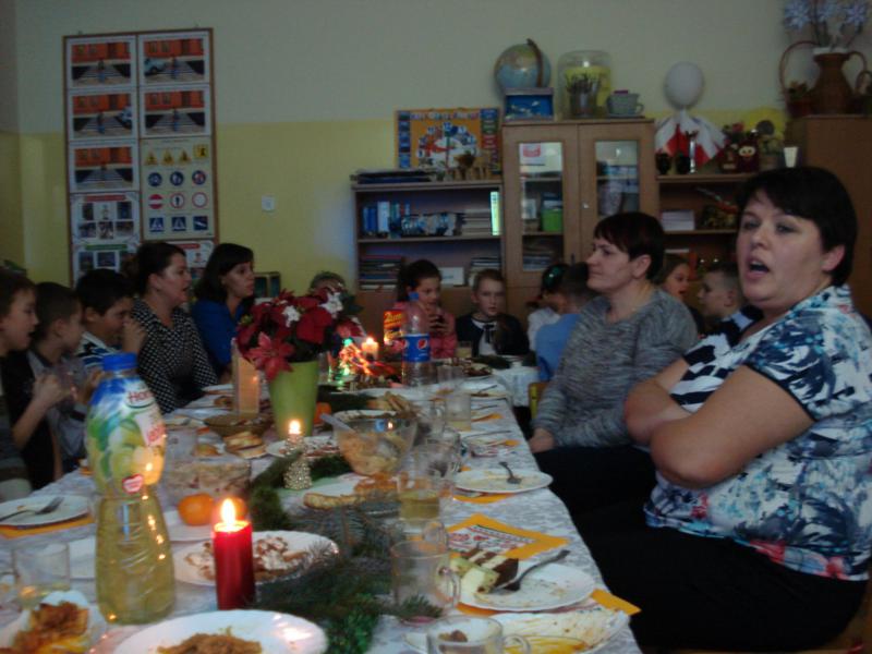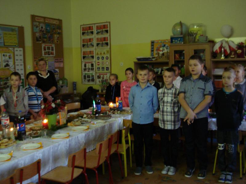 spodem, uczniowie wraz z rodzicami ustawili nakrycia i potrawy wigilijne. Był