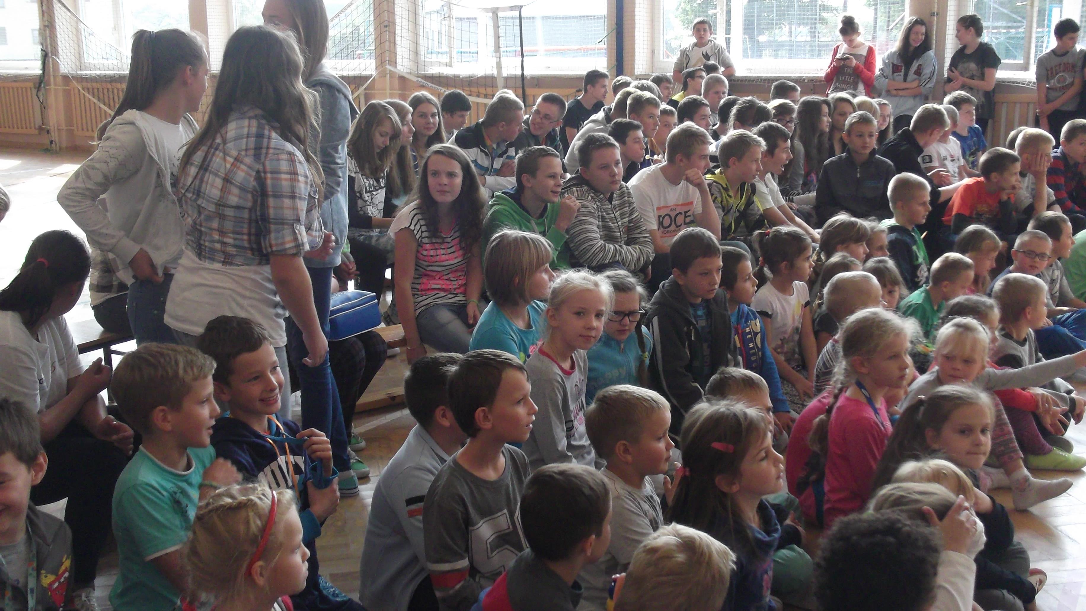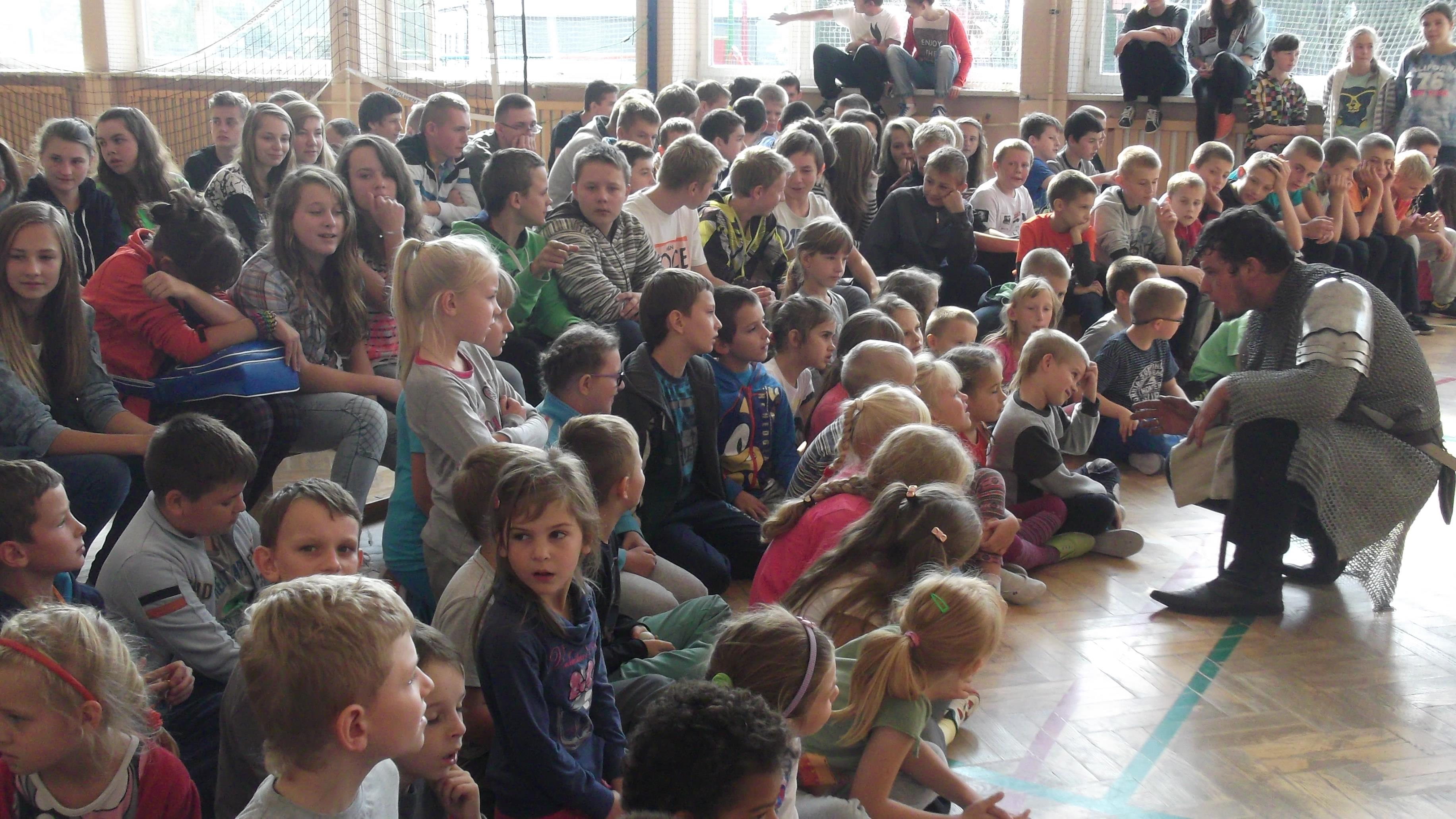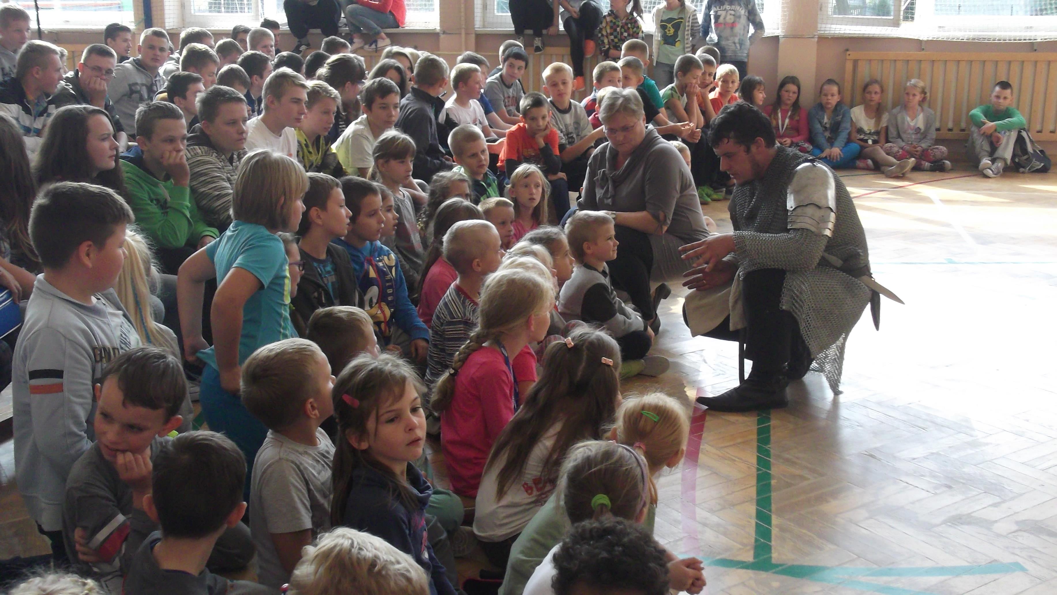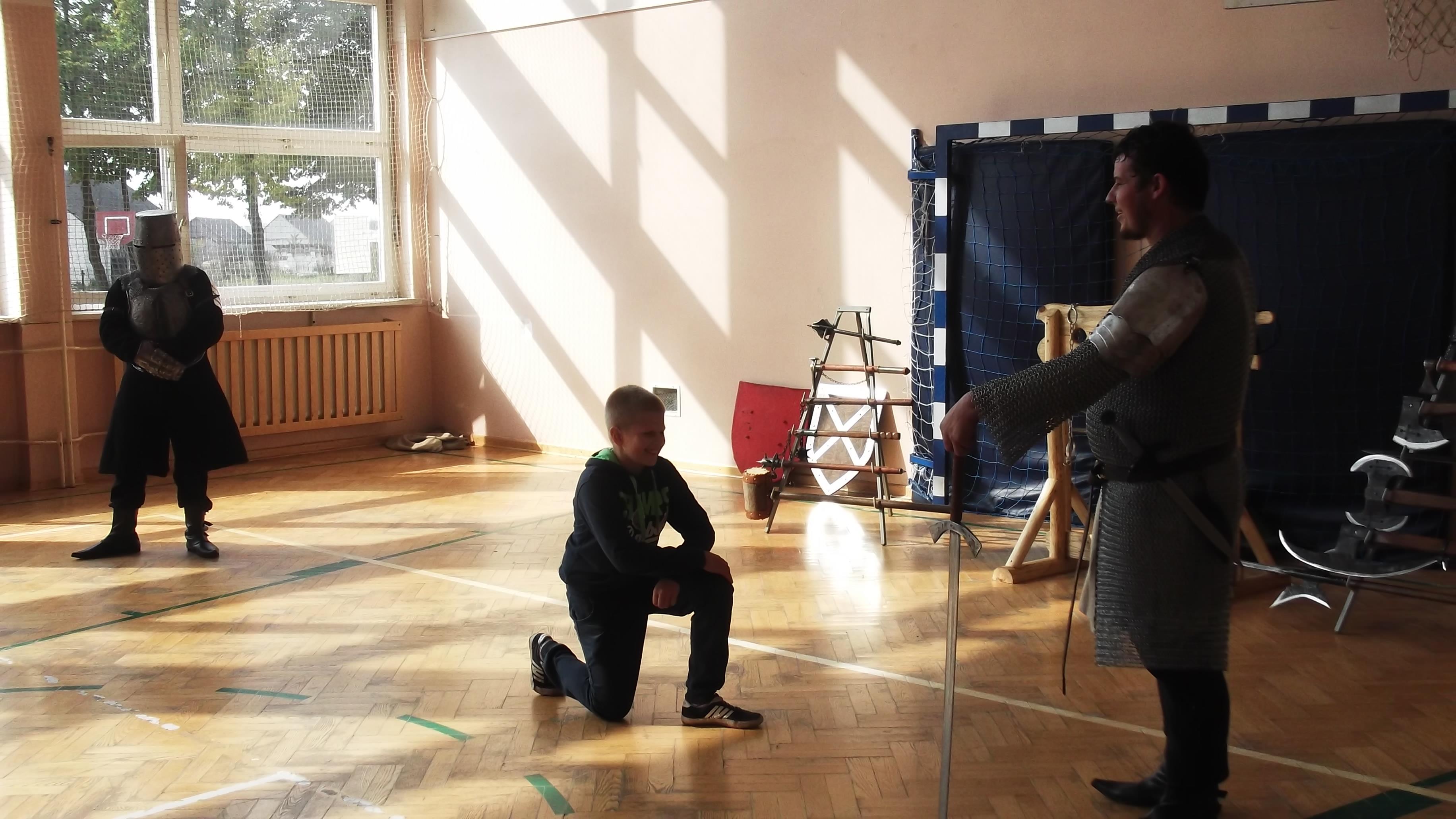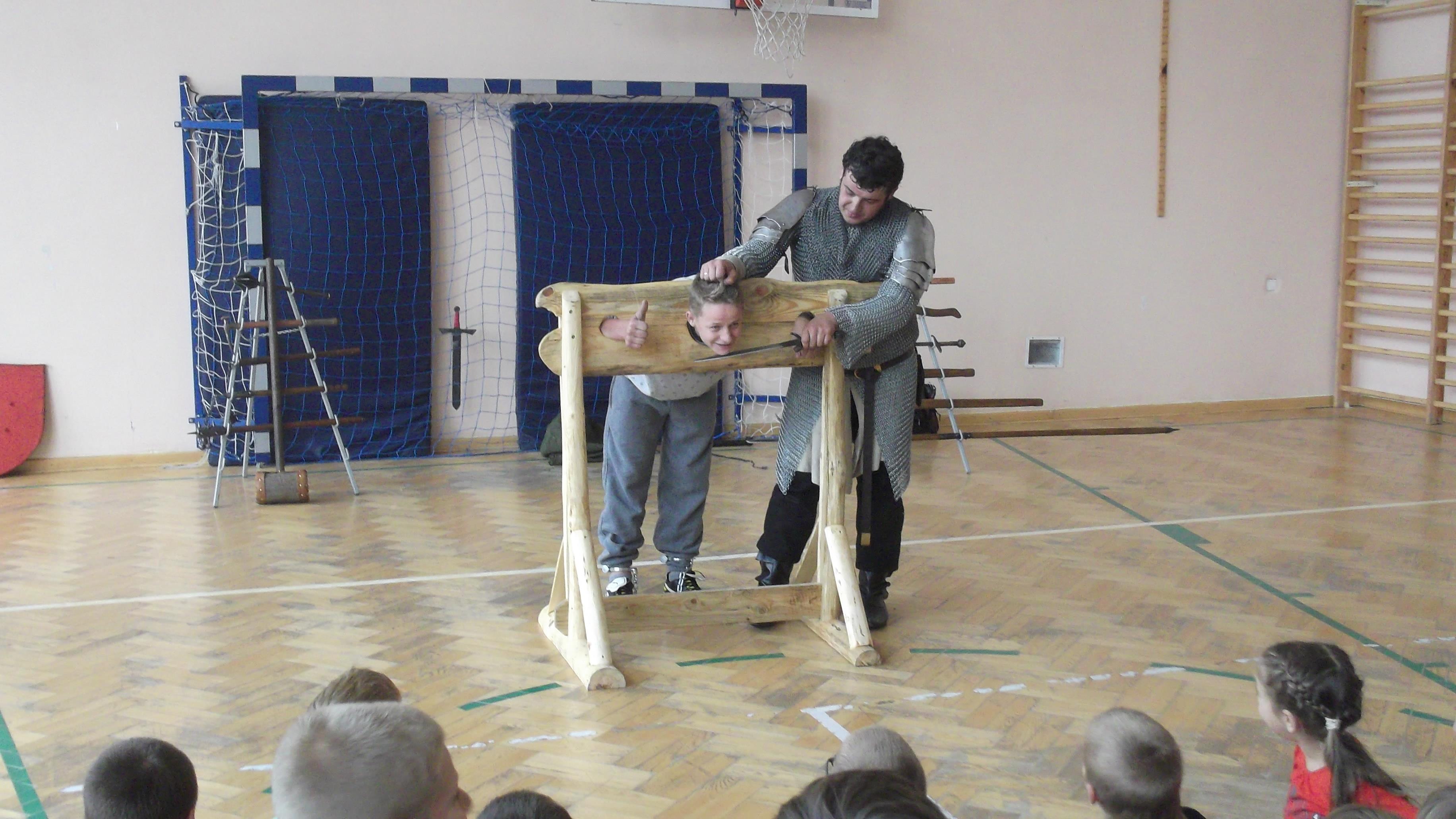 We wrześniu do naszej szkoły przyjechali panowie, którzy prezentowali ekwipunek średniowiecznych rycerzy. Mieliśmy możliwość założenia zbroi, obejrzenia broni - mieczy, maczug i noży oraz przymierzenia się do narzędzia tortur, jakim były dyby. To był ciekawy pokaz, zresztą zobaczcie sami.